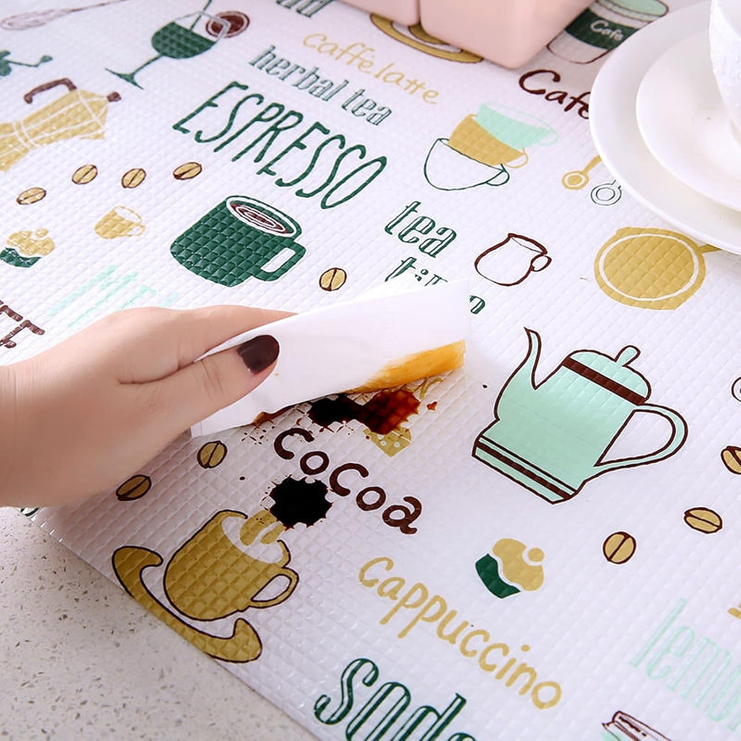 IDLE USE: Our table mat rolls are suitable for the kitchen cabinets, refrigerator, wardrobe shelves, shoe cabinet, safe for food & vegetables. It is an anti-oil moisture absorption table mat.