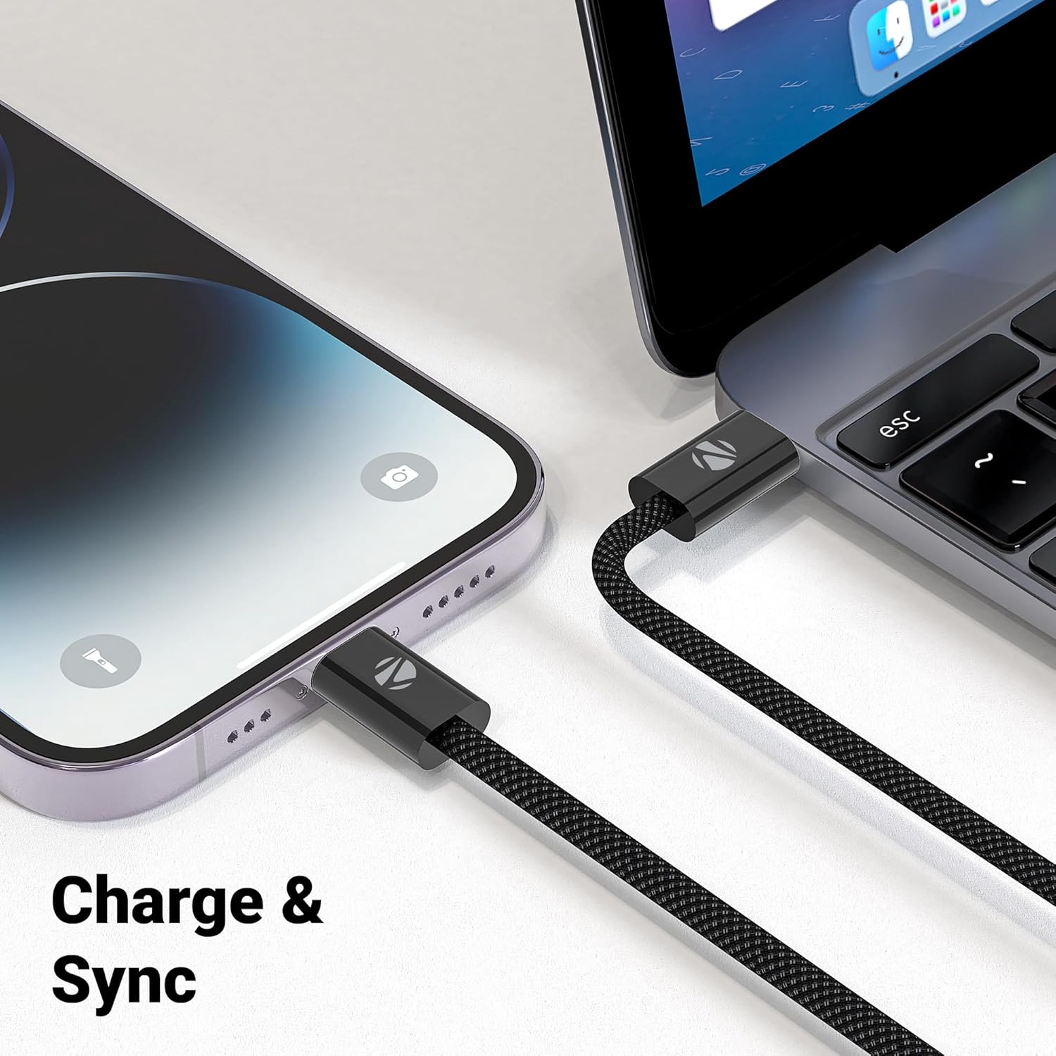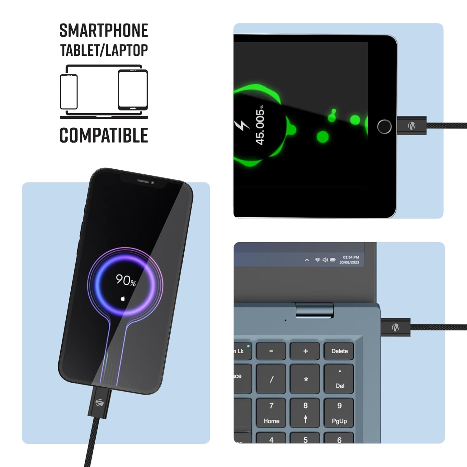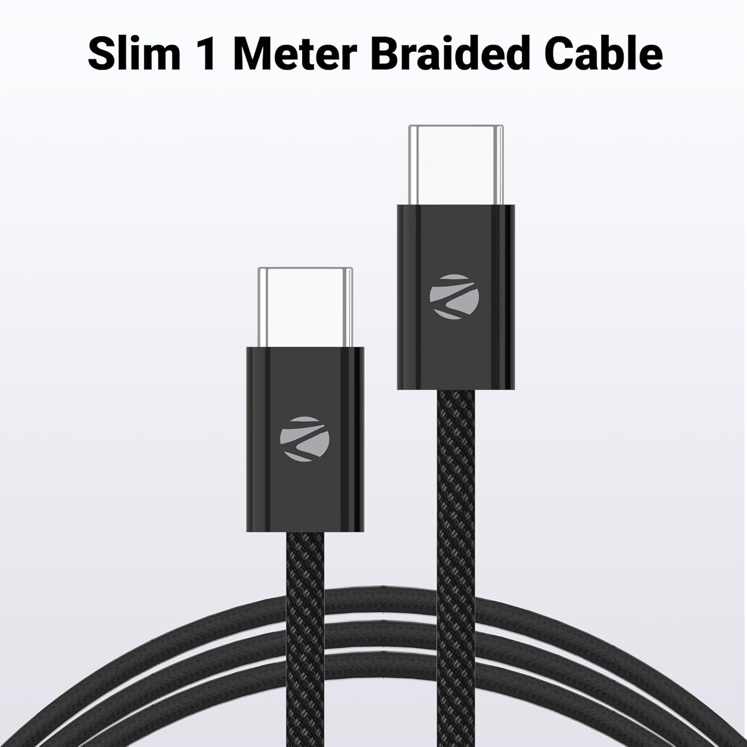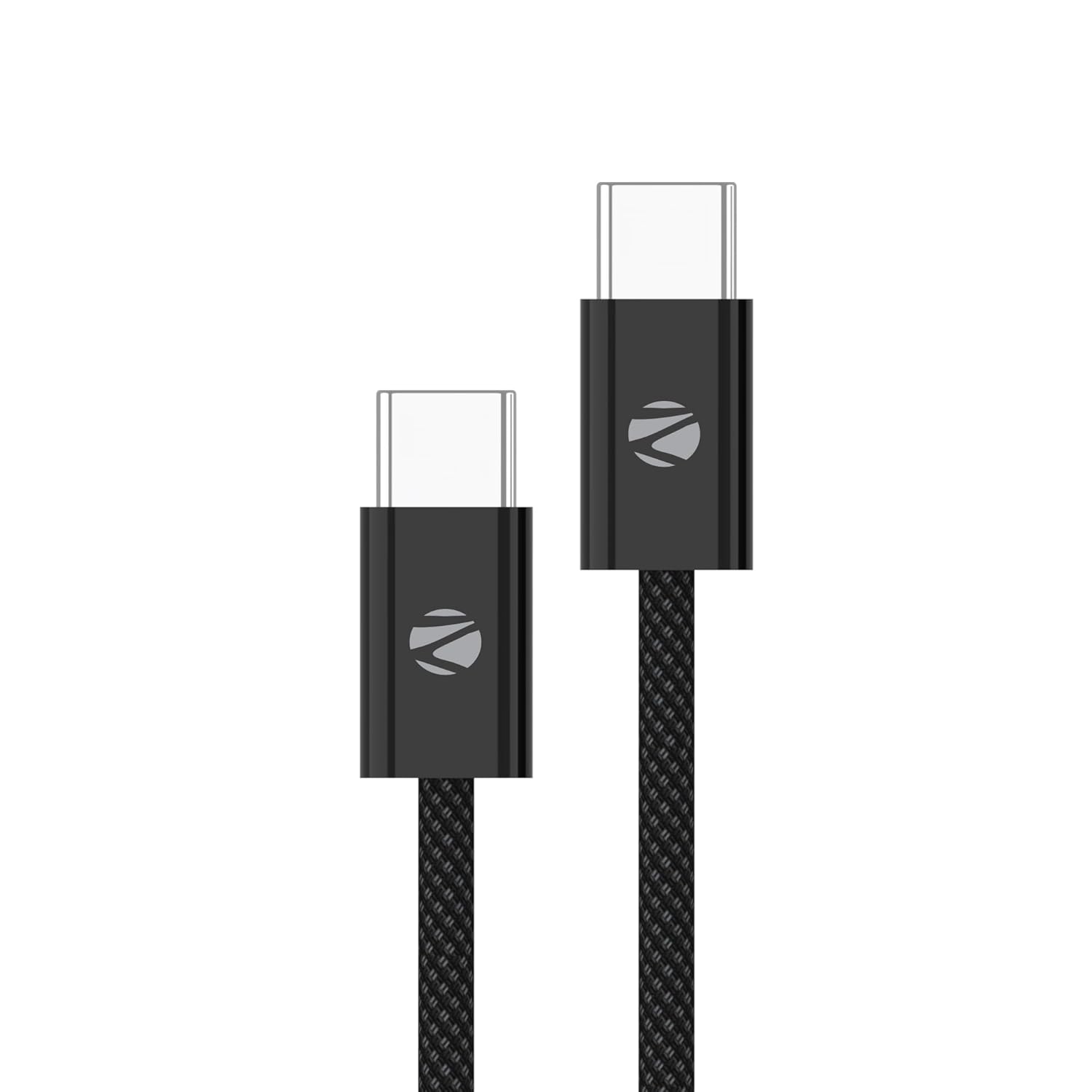 Zebronics TT60+ Type C – Type C Braided Cable, 60 Watts, Rapid Charging, Charge & Sync, 1 Meter, Compatible with iPhone 15 | Samsung | OnePlus | Xiaomi | Realme | Oppo Black
