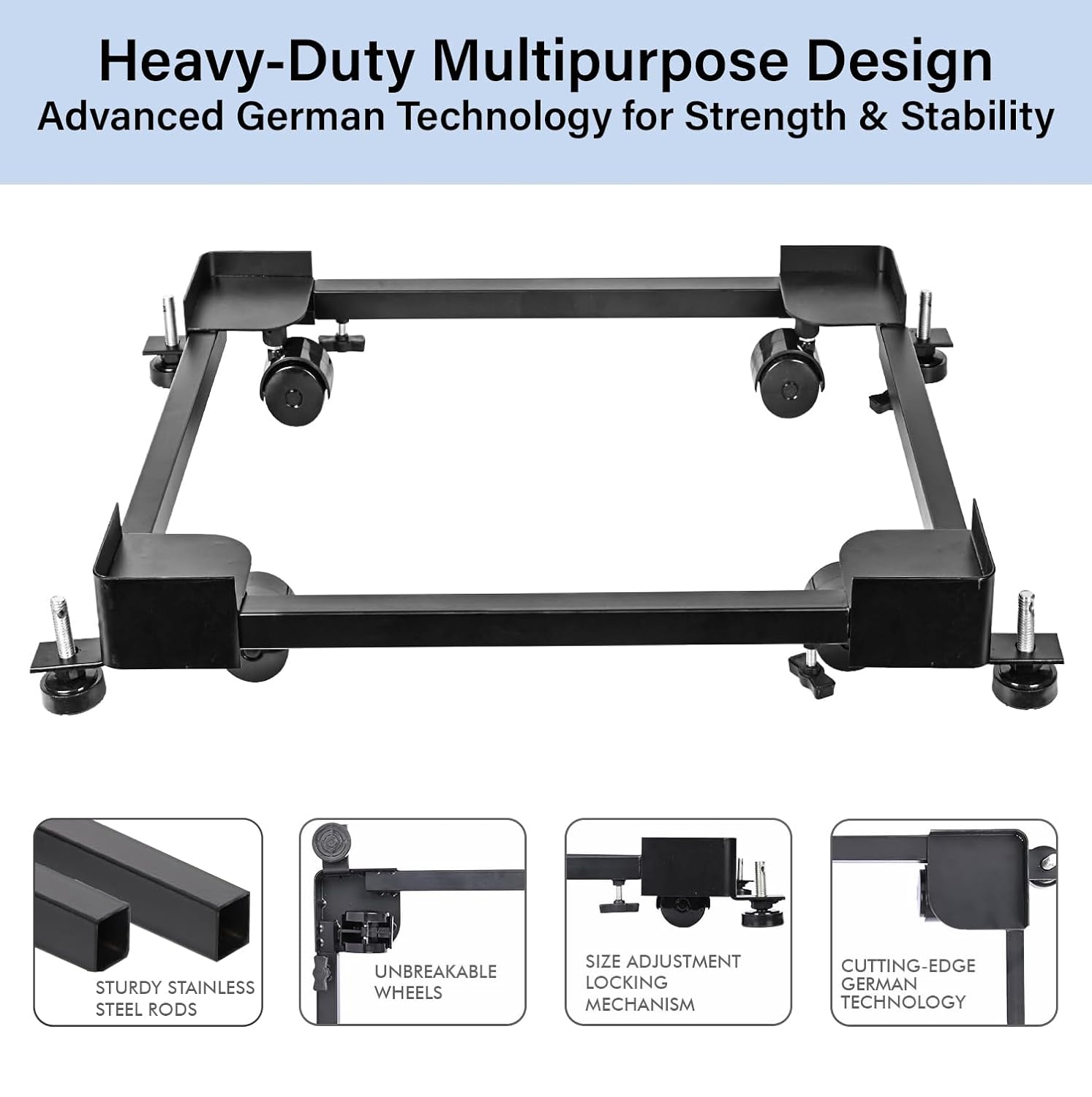 CUTTING-EDGE GERMAN ENGINEERING: Precision engineered using advanced German technology, this adjustable stand ensures strength, stability, and efficiency. Suitable for all appliances like washing machine trolley stands, fridge stands with wheel, dishwashers, and air coolers. Designed for reliable performance and long-term durability in everyday use.