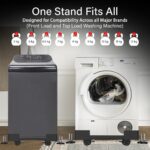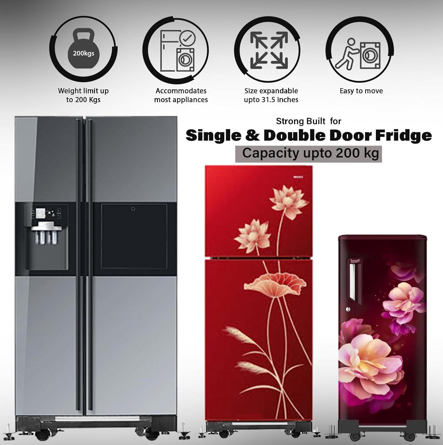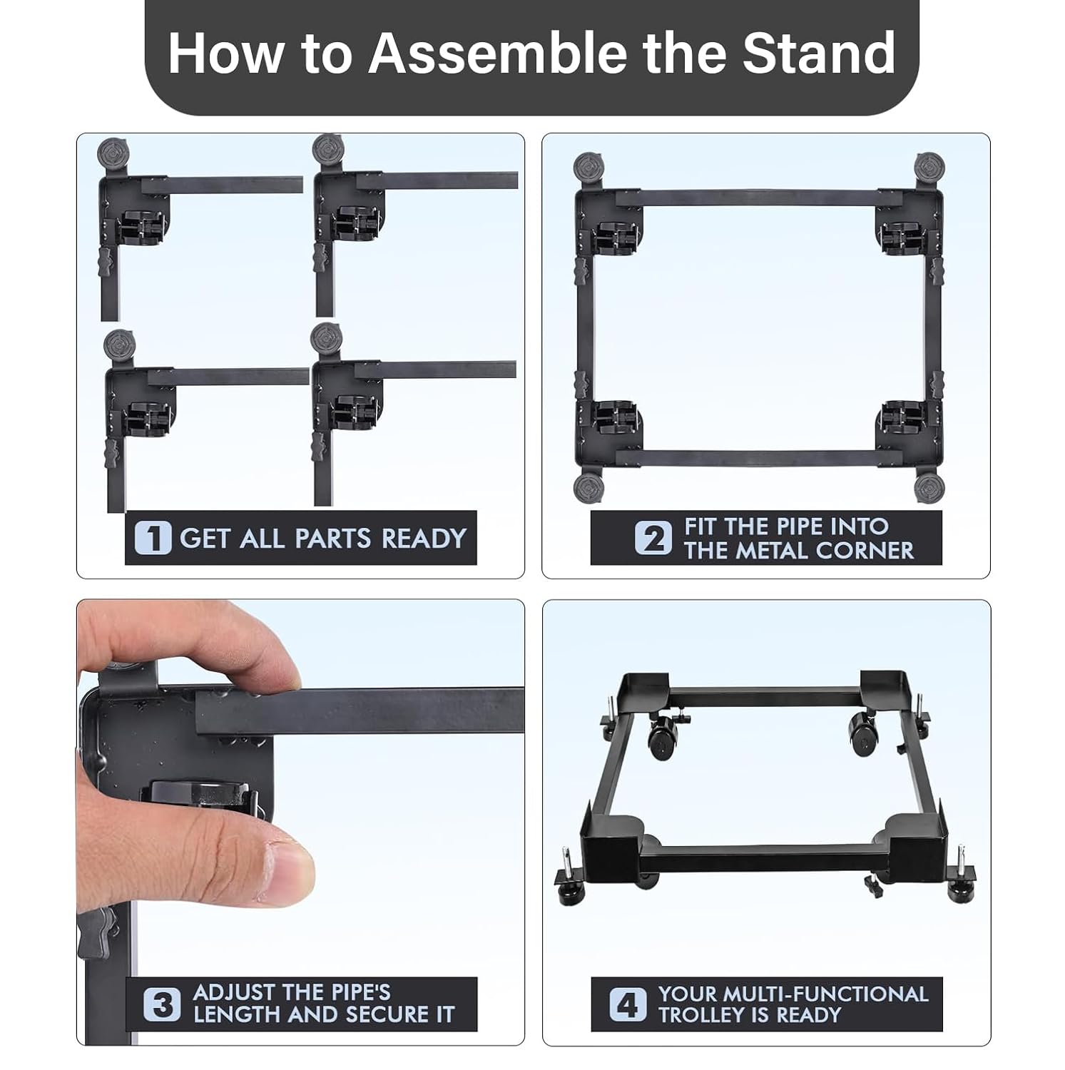 MODERN & MULTIPURPOSE DESIGN: Sleek, rust-resistant finish enhances durability and complements modern interiors. This multipurpose appliance stand is adjustable and compatible with washing machines, refrigerators, dishwashers, and air coolers. Perfect as a heavy duty washing machine stand or fridge trolley with wheel for versatile home use.