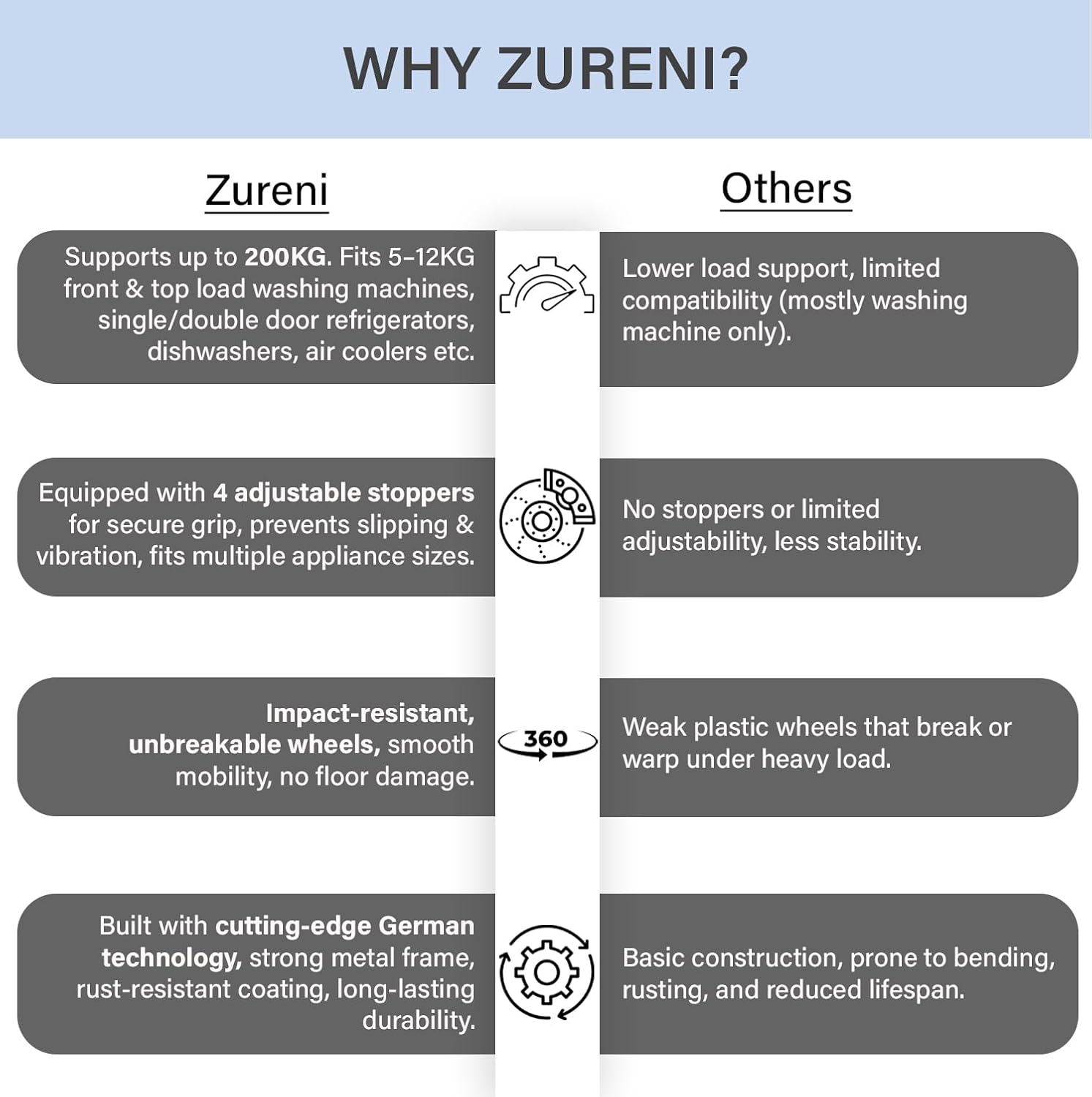 8 reviews for Zureni Adjustable Front/Top Load Washing Machine Stand (5 to 15 KG) Heavy Duty Metal 230KG Capacity Single/Double Door Fridge Refrigerator & Air Cooler Trolley with Nylon Wheels & Anti Vibration Pad